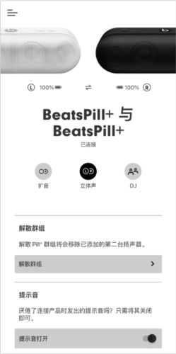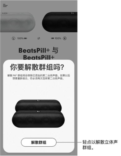 通过 Beats App 来创建由两台 Pill+ 扬声器组成的立体声群组,其中一台作为左声道,另一台作为右声道。