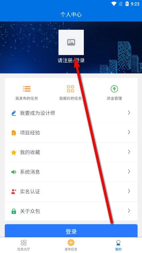 打开沐风众包,在“我的”页面里找到【请注册/登录】选项。