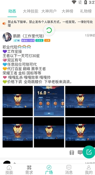 首先在本站完成软件安装后,进入技能主页面就能看到众多陪玩发布的信息。
