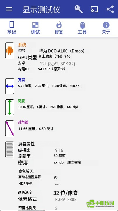 2、除了可以检测屏幕缺陷外,还能够提供详细的技术参数,像屏幕尺寸、GPU类型、dpi、像素大小信息等。