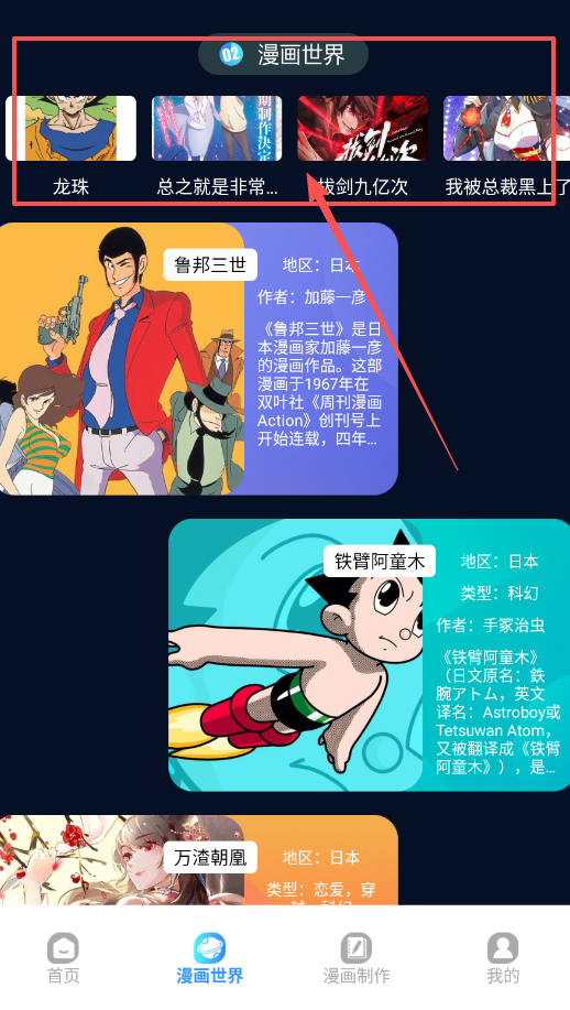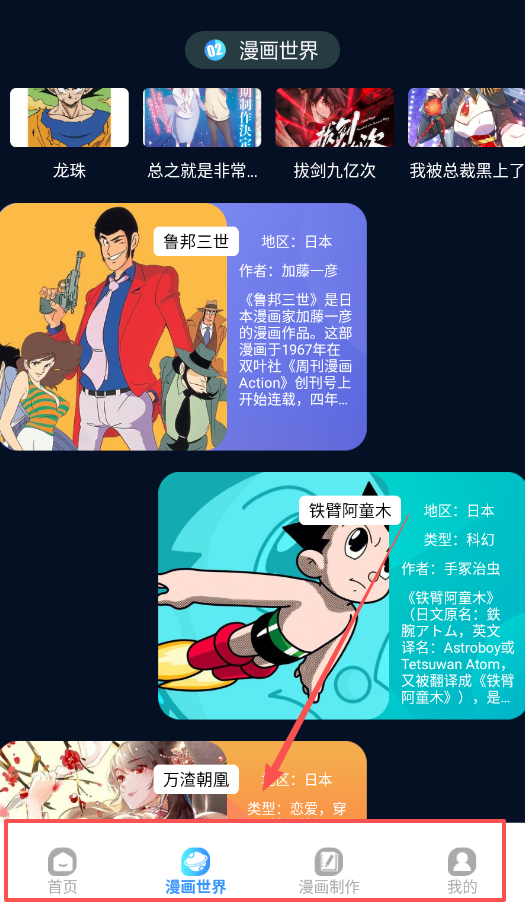 在漫画世界页面,你可以浏览到龙珠、万道朝凰等各类作品,借助阅读摘要信息就能快速选定下一本读物,使找书的过程变得轻松便捷。