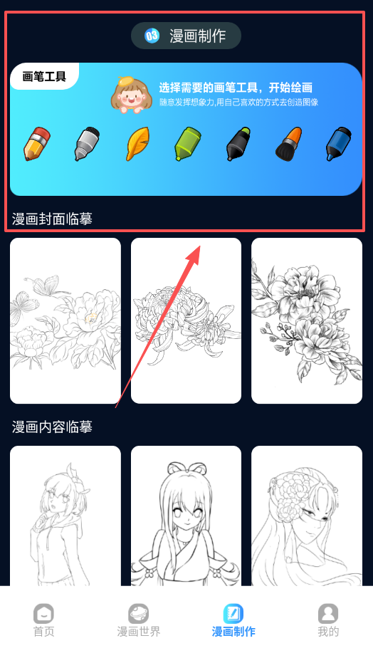 3、若你想亲自尝试绘画,可进入漫画制作模块,选定画笔工具后即可开启临摹或自由创作之旅,跟着指引尽情施展创意,感受亲手绘制带来的乐趣。