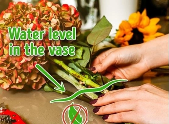 为了让鲜花保鲜时间更长,建议去除所有位于水位线以下的叶子。因为浸泡在水中的叶片容易迅速腐烂,进而成为细菌的养料,这会导致细菌感染并损害植株的其他部位。