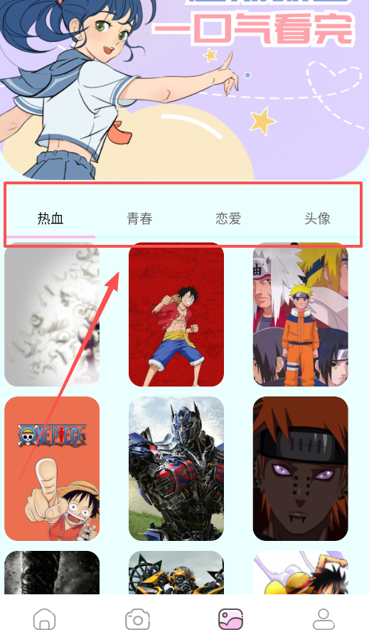 3、在一口气看完板块里,大家能借助热血、青春、恋爱、头像这类标签,快速筛选出自己感兴趣的内容,点击标签就能进入详情页面进行观看或者使用。