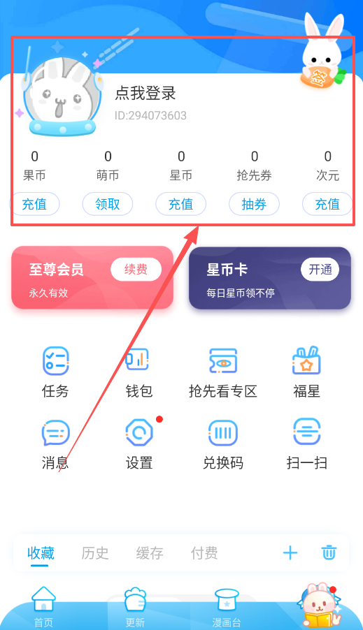 1、首先,打开漫画台应用,在首页右下角找到“我的”选项并点击进入,然后点击页面上的“点我登录”按钮。