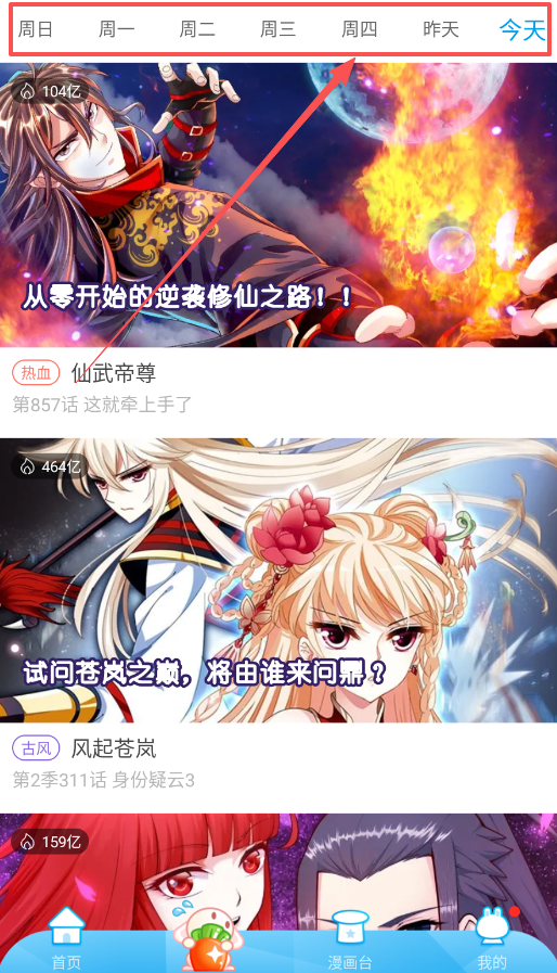 3、接下来,关注漫画更新其实很简单,在更新页面就能看到一周的更新日历,上面标注了每天会更新的漫画,这样你追更感兴趣的作品就方便多了。