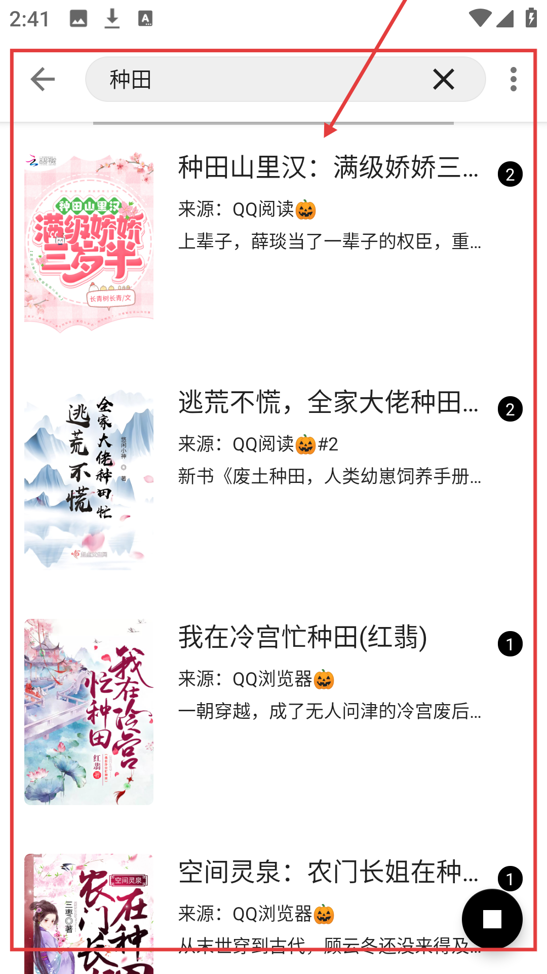 1、搜索“种田”关键词,挑选一本你感兴趣的小说,比如《种田山里汉:满级娇娇三岁半》,然后点击进入该书的详情页面。