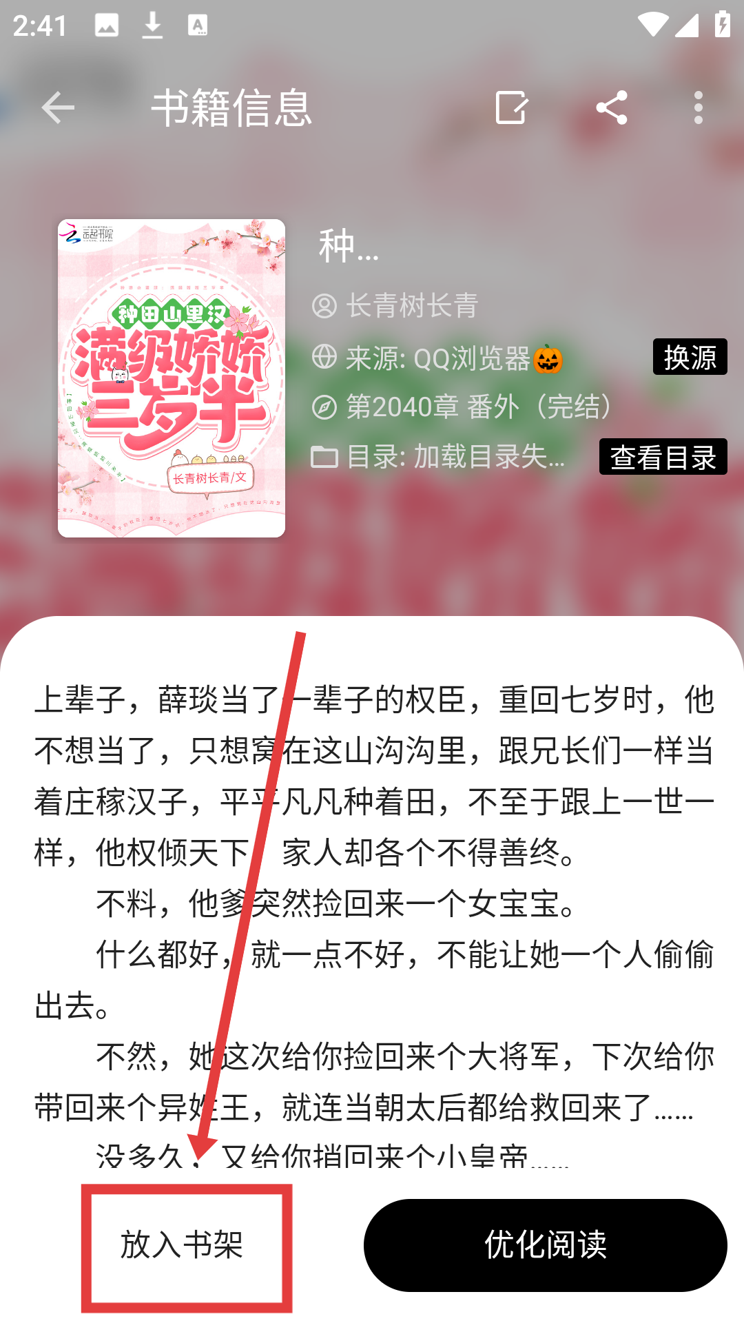 2、在书籍信息界面点击【放入书架】按钮,即可将该小说添加至书架,便于后续随时阅读。