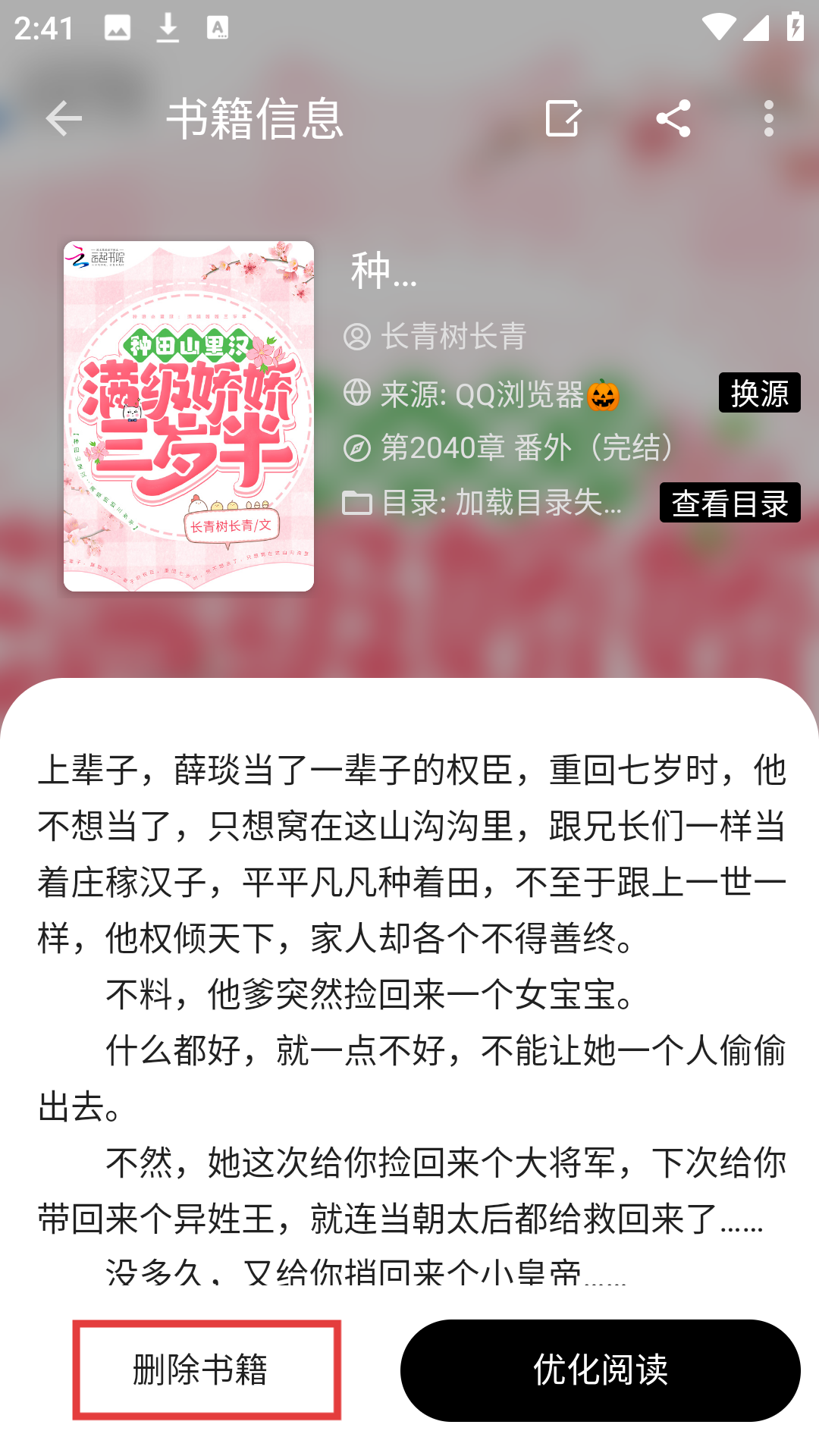 3、要是不想继续阅读了,点击【删除书籍】按钮,就能把这本小说从书架上移除啦。