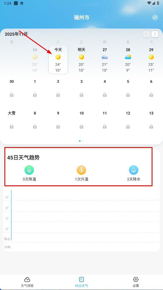切换到45天天气页面,查看【45日天气趋势】(包含降温、升温情况以及降水次数),以便提前做好出行规划。