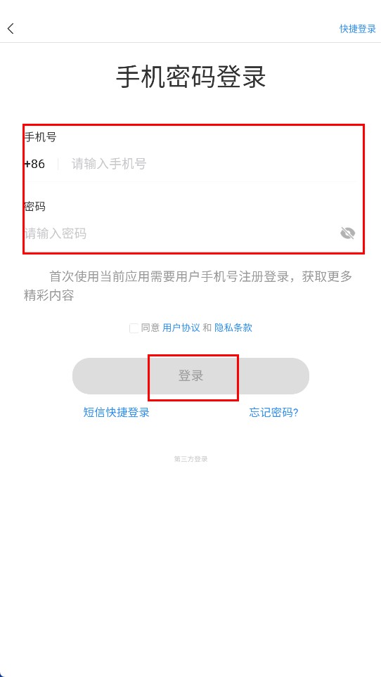 还可以选择【账户密码登录-功能选项】,输入手机号与密码后,点击【登录-功能按钮】完成登录操作。