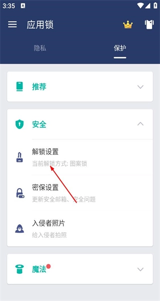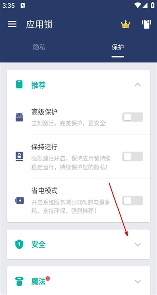 1、打开应用锁软件,进入保护页面,找到安全板块,点击该板块的展开选项,可查看安全相关设置项。