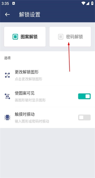 3、进入解锁设置界面后,看到当前为图案解锁,点击密码解锁选项,可切换至密码解锁的设置流程。