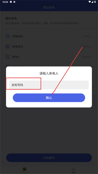 4、在来电人设置,输入来电人名称(默认【未知号码】),点击【确认】按钮,完成来电人信息配置。