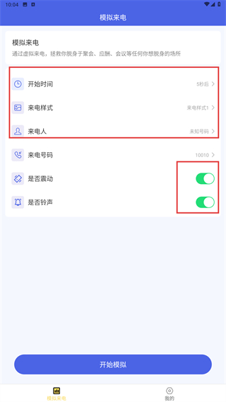 1、在【来电有喜】主界面,设置【开始时间】【来电样式】等参数,开启【是否震动】【是否铃声】功能,准备配置模拟来电。