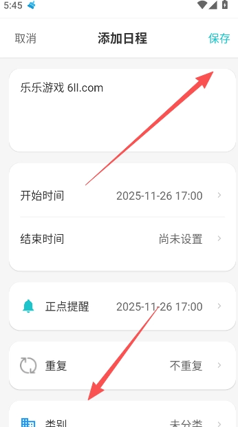 2、在日程信息编辑栏中填写内容,选定开始与结束时间,设置好类别后保存即可。