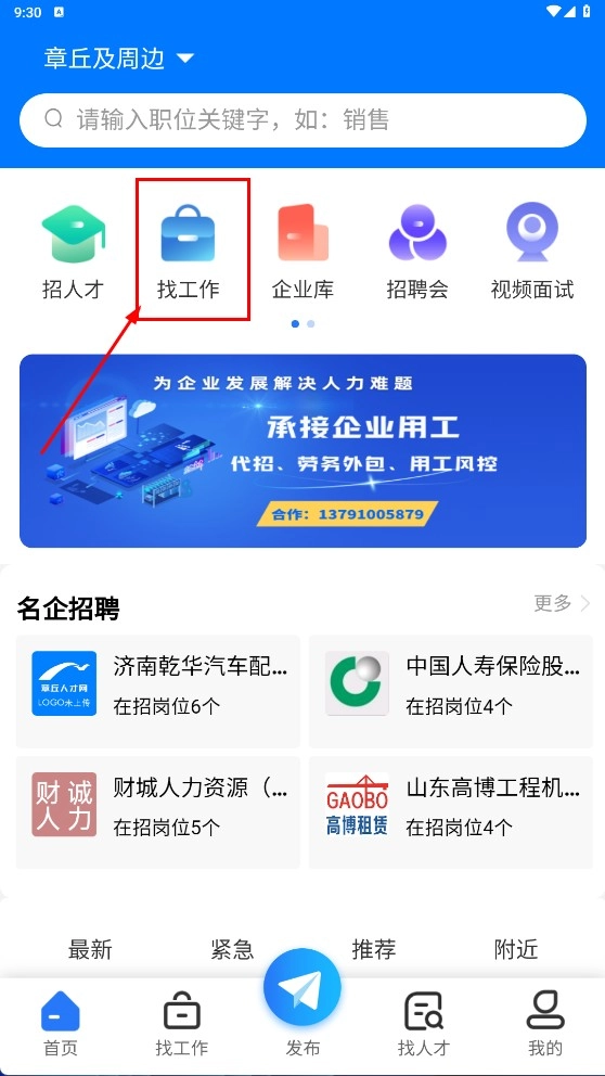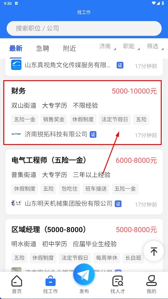 在首页点击【找工作】选项,即可进入职位浏览页面,在此页面可以查看本地的招聘信息。