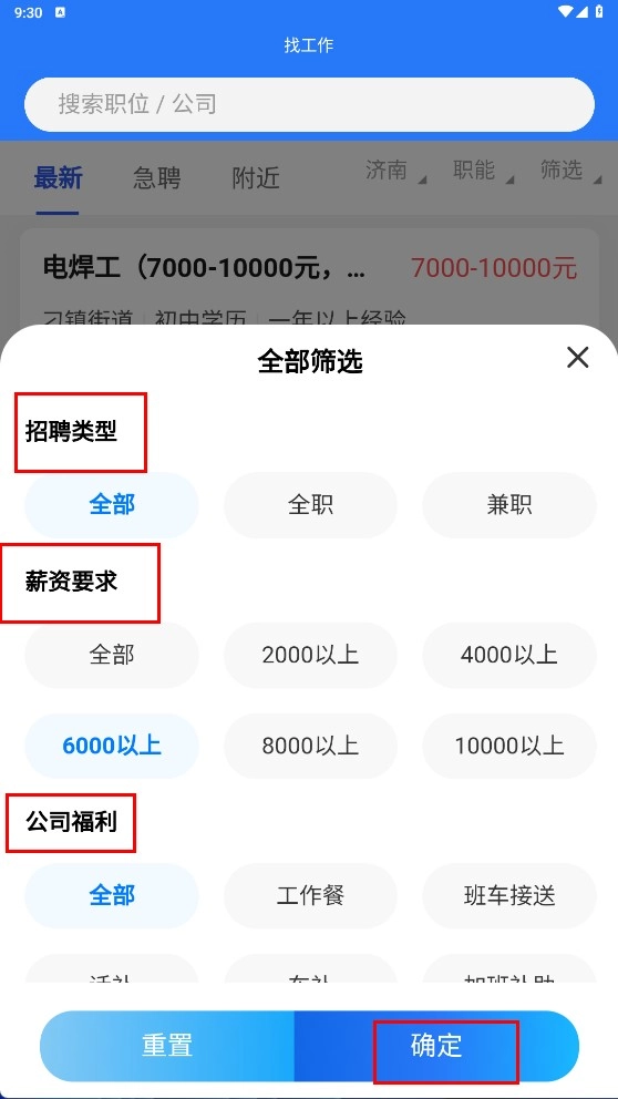 在“全部筛选”页面中,可根据自身需求挑选“招聘类型”“薪资要求”“公司福利”等筛选条件,选好后点击【确定】按钮,就能精准找出匹配的职位。