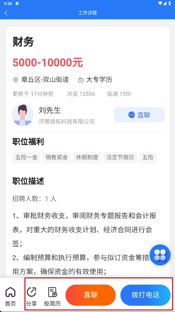 在工作详情页面,您可以通过【直聊】功能与招聘方进行沟通,也能点击【拨打电话】直接联系对方,还可以操作【投简历】来完成职位申请流程。