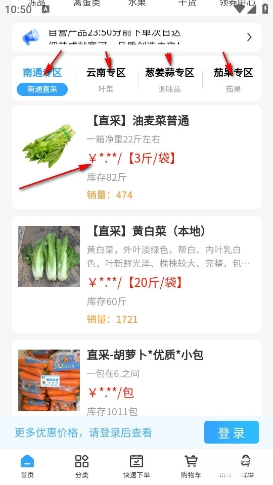 我们可以在首页下方的地区专区找到蔬菜和水果,点击进入详情页即可进行购买。