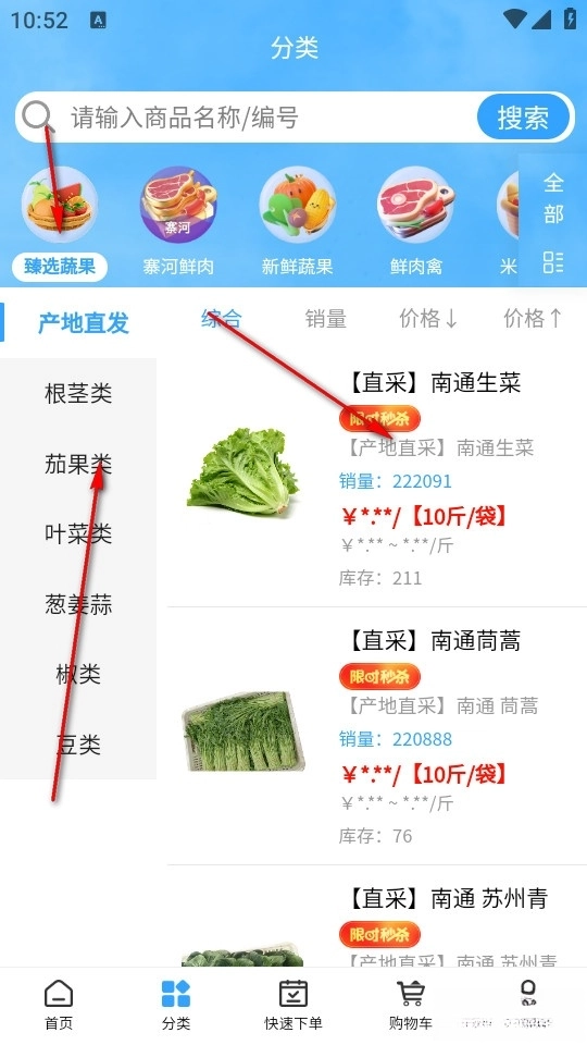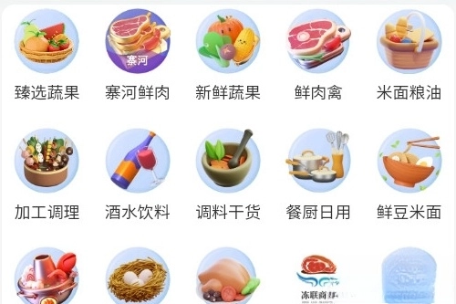 我们可以在软件的主页找到需要采购的生鲜物品类别,挑选其中一个就能进入该分类的商品选品界面。