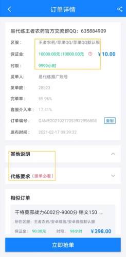在选择你有意承接的订单时,请务必认真核对区服信息、保证金金额、服务时限,以及其他补充说明和具体的代练要求,确认无误后点击“立即抢单”按钮。