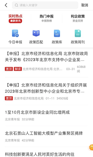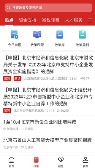 用户可点击下方政策板块,查看北京市热点政策及资金支持、减税降费等实时政策内容,助力企业快速掌握政策信息,及时调整经营策略。