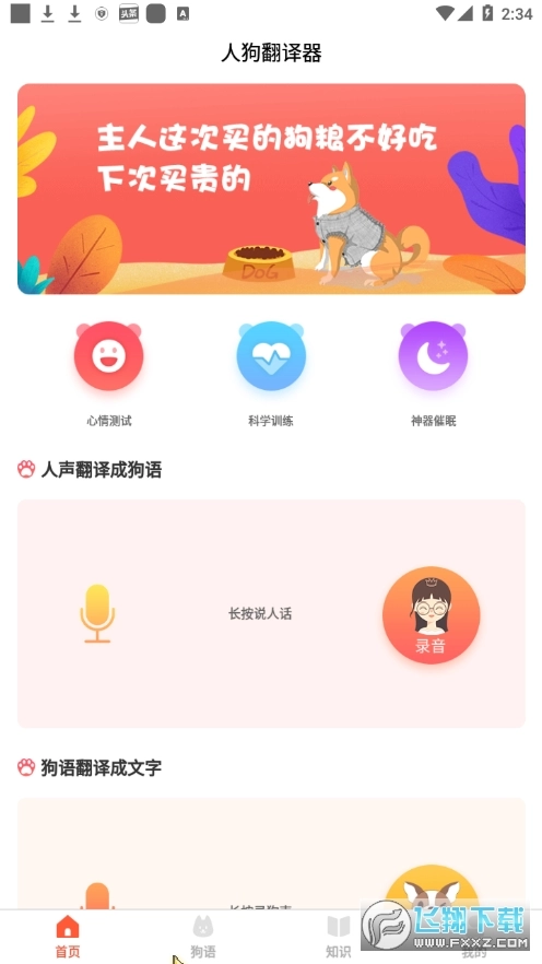 狗狗交流器是养狗人士不可或缺的人狗翻译工具,它能把人类语言转换成狗狗能理解的语言,也能将狗狗的叫声翻译成文字,还可以通过指纹探测功能了解狗狗当下的情绪状态,此外还有大量实用的养狗相关资讯文章,如果你对这款软件感兴趣,不妨下载体验一下!