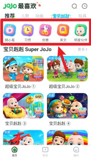 2、登录成功后进入首页,点击上方推荐、儿歌等标签,可快速浏览各类精选内容。