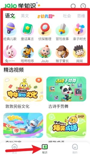 4、切换至知识页面后,可根据语文、英文、社会等分类选择感兴趣的学习内容。