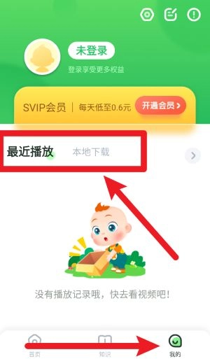 5、点击右下角我的按钮,可查看最近播放记录、内容及开通SVIP等个性化服务。
