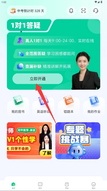 2、成功登录后进入主界面,点击1对1在线辅导模块点击立即开通购买课程服务。