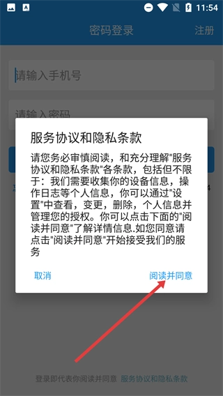 当弹出【服务协议和隐私条款】的窗口后,请仔细阅读条款内容,随后点击【阅读并同意】按钮,完成协议确认,以便继续进行后续操作。