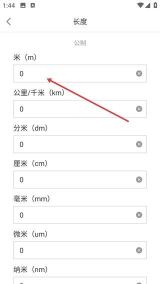 在长度单位换算页面的米(m)输入框中填入需进行换算的数值。