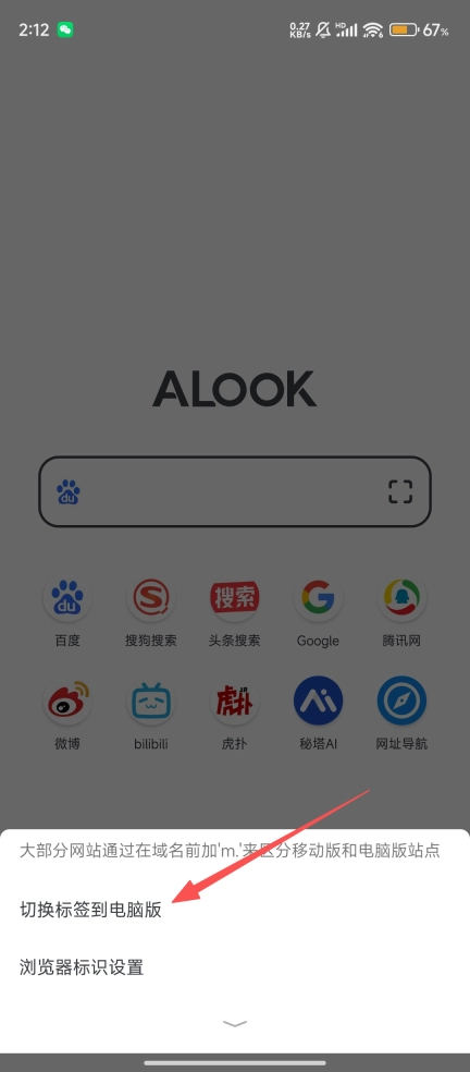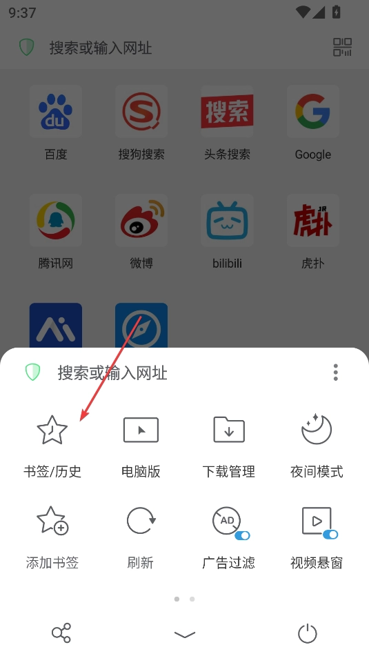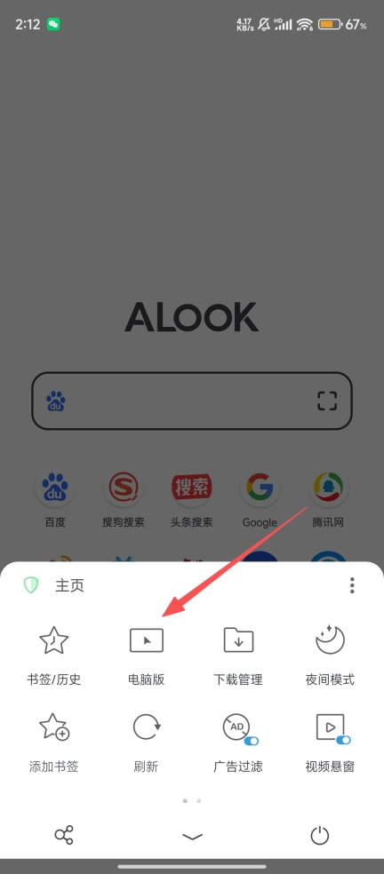 1、打开Alook浏览器后,点击底部的三条横线菜单按钮,展开各项功能选项。