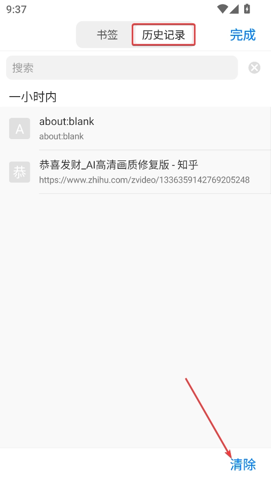 3、在界面上方找到并选择“历史记录”选项,接着点击右下角的“清除”按钮,之后根据需要选择对应的时间范围来删除历史记录。