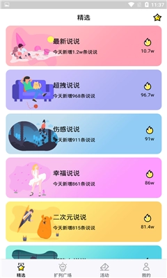 空间说说扩列来啦!这可是一款超赞的社交神器哦~它以空间说说为桥梁,把爱发表语录的小伙伴们都聚集在一起,里面还有成千上万条经典语录呢!喜欢社交的你,一定要来体验一下这款软件呀!