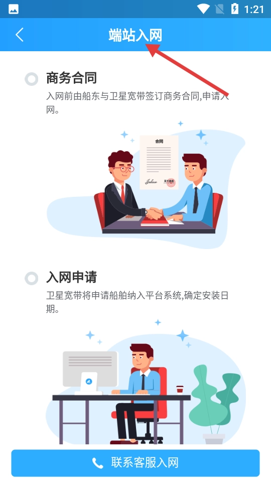 端站入网界面清晰呈现入网步骤,流程为先签订商务合同,随后提交入网申请;界面底部设有“联系客服入网”按钮,以引导用户完成操作。
