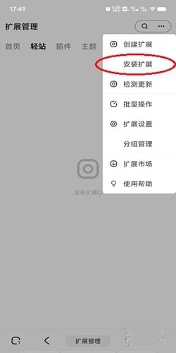 2、然后点击右上角的三个点,选择“安装扩展”。