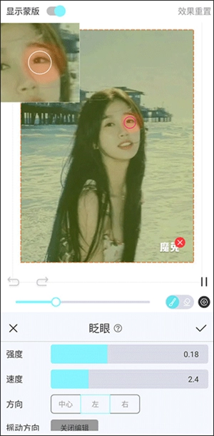 5、以热门的眨眼特效为例,先调整好画笔的粗细,之后用画笔涂抹图片里的眼睛区域,就能生成对应的效果了。