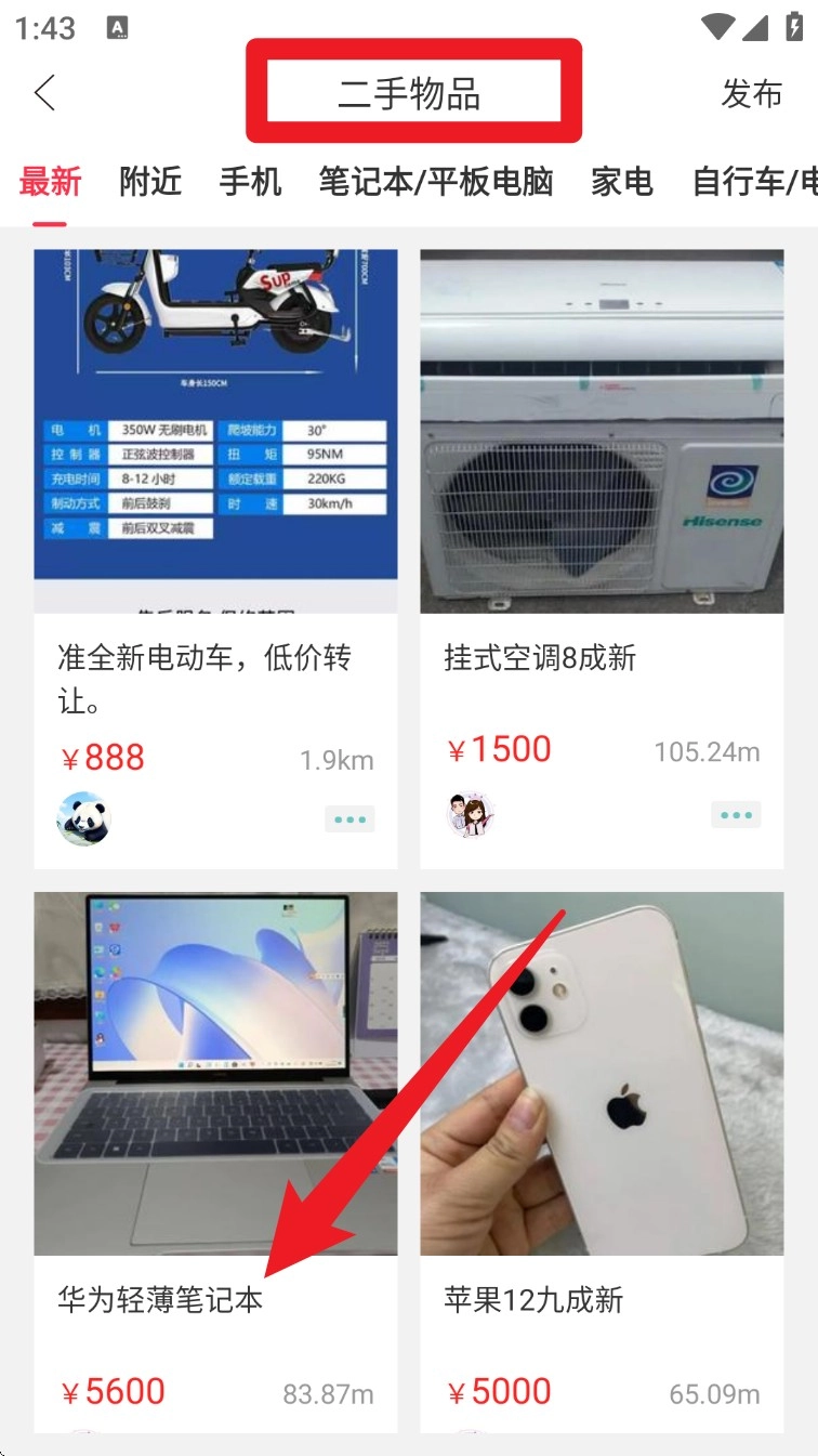 4. 点击二手物品可查看附近用户发布的转售信息,支持分类筛选与留言联系。