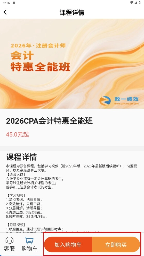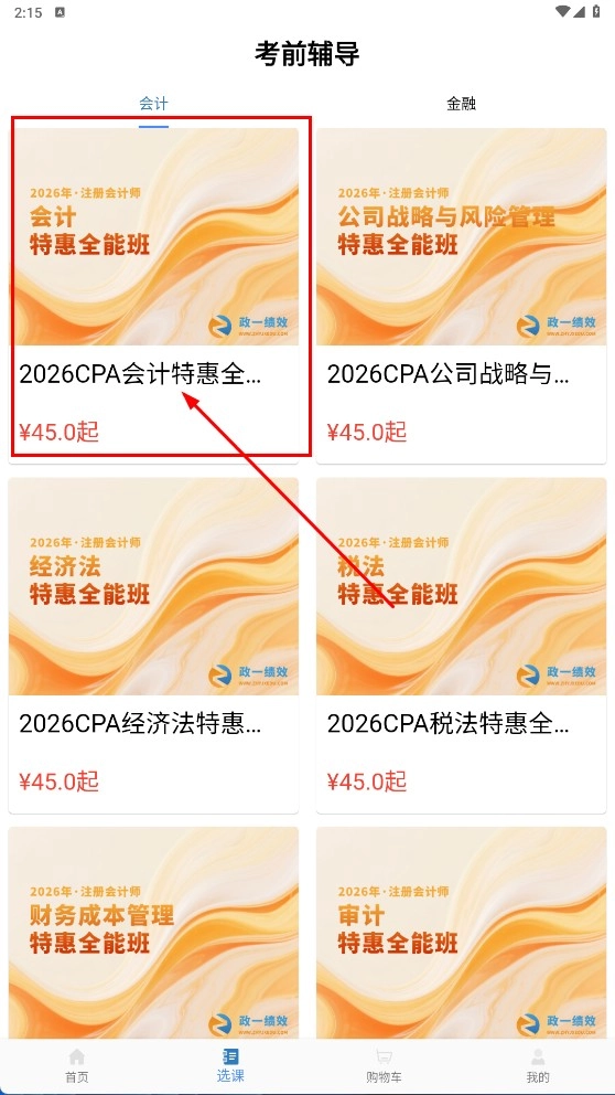 在考前辅导板块,挑选对应的科目课程,例如【2026CPA会计特惠全能班】,然后进入该课程的详情页面。