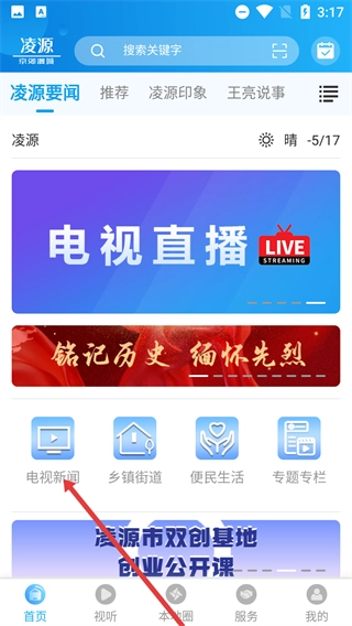 点击底部的【首页】按钮,就能进入凌源融媒的首页界面,在那里可以浏览凌源要闻以及各类功能的入口等相关内容。