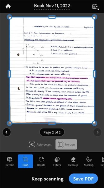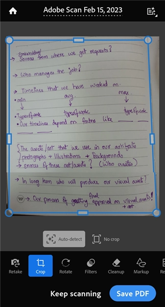 该应用程序使用“自动裁切”功能和“图像清理”功能来提高扫描质量。捕获到的扫描内容将显示在屏幕上,并带有裁剪手柄和修改工具菜单。