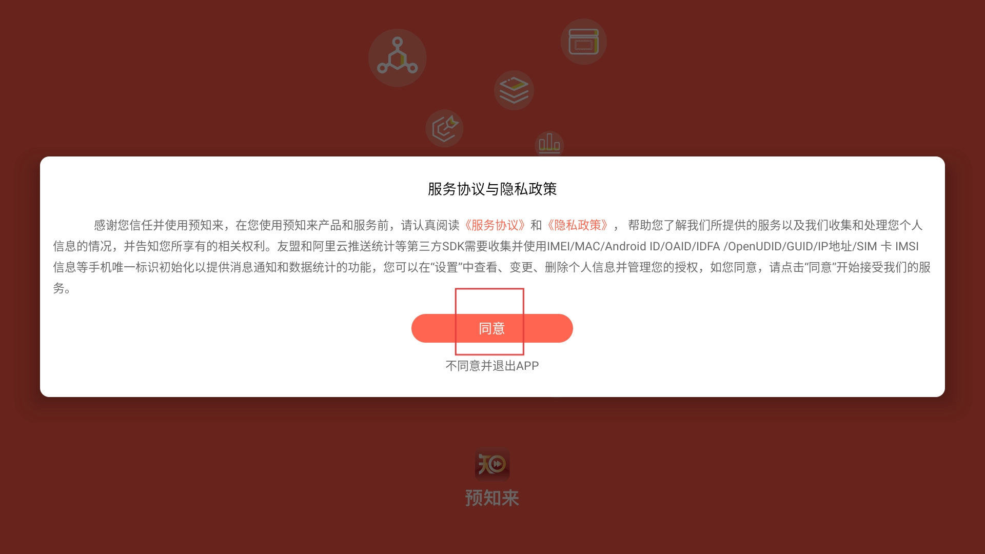 在服务协议与隐私政策页面,点击【同意】功能按钮,接受相关条款后即可继续使用。