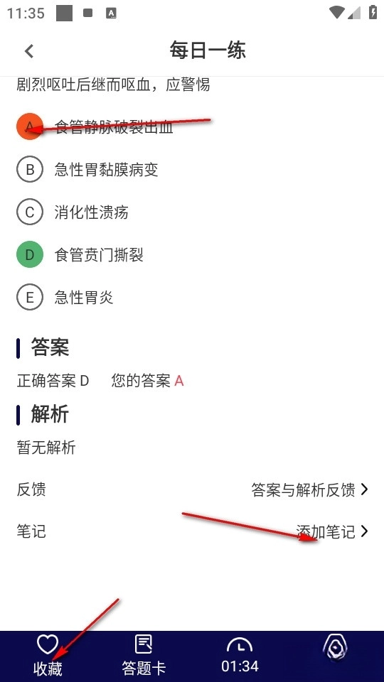 当我们选错题目后,若想把这道错题记录下来,我们可以选择记笔记或者收藏该题。