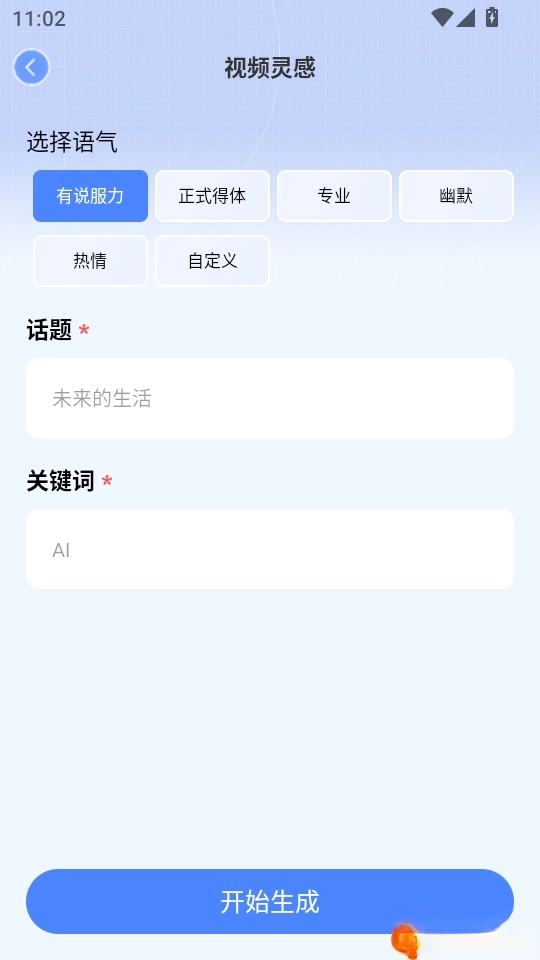 5.接着,大家选定语气风格,输入所需的话题与关键词,之后点击“开始生成”按钮,即可进入后续步骤。