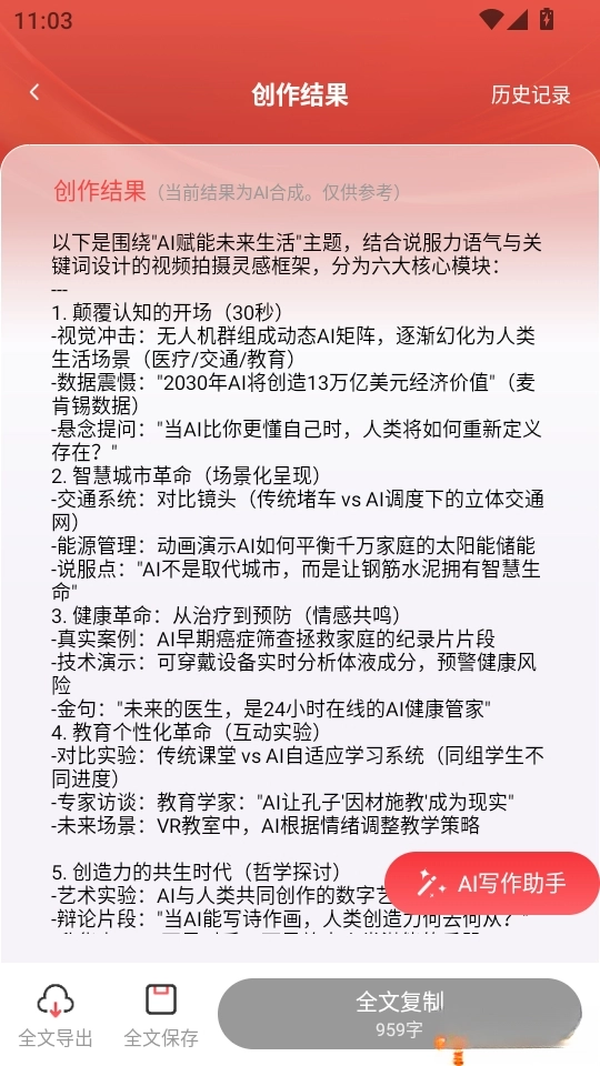 6.接下来大家就能得到AI生成的内容了,点击“全文导出”按钮即可完成保存操作。