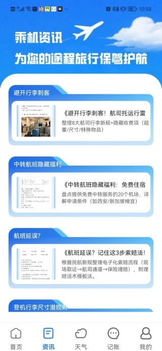 2、在资讯页面中可以了解关于乘机的各类资讯,帮助解决各类遇到的问题;