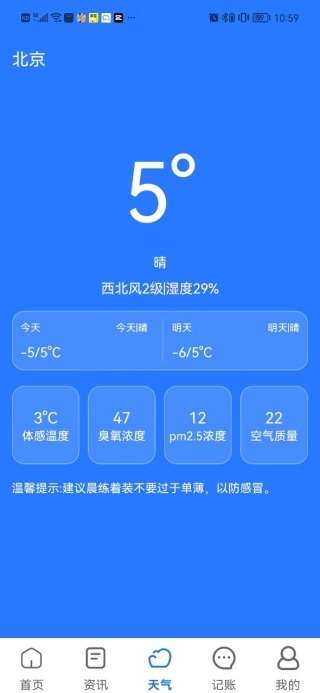 3、在天气页面中可以了解当地最新的天气情况,还有空气质量等分析;